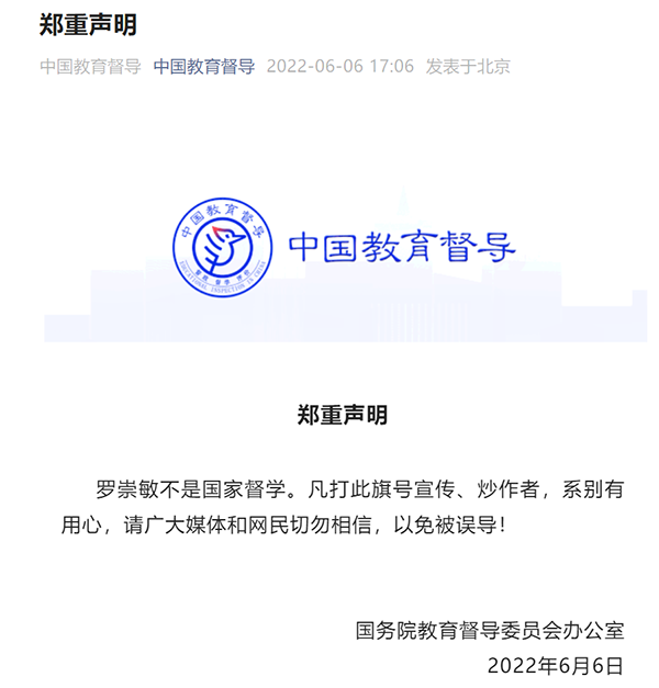 教育部教育督导局微信公众号6月6日发布《郑重声明》,指出: