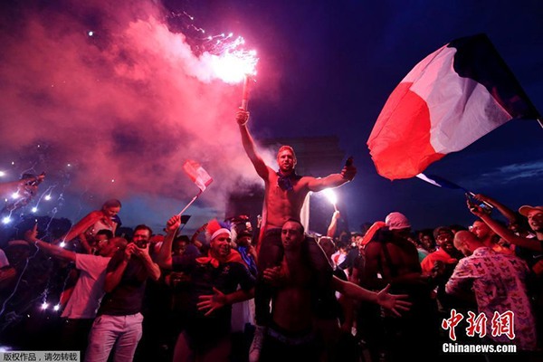 资料图:2018俄罗斯世界杯,法国队最终夺得冠军,法国巴黎香榭丽舍大道挤满庆祝的球迷。