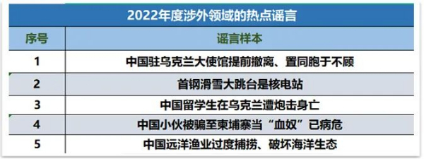 2022年2月,个别外媒发出“首钢滑雪大跳台是核电站”的歪曲报道,荒谬至极。乌克兰危机爆发不久,网传“中国驻乌克兰大使馆提前撤离、置同胞于不顾”,实际上当时中国驻乌克兰大使仍在基辅,并通过包机、包车等方式组织中国公民有序撤离。这类失实消息严重损害我国际形象。还有如“中国远洋渔业过度捕捞、破坏海洋生态”的传言一度沸沸扬扬,但真实情况却是中国人吃鱼主要靠养殖而非捕捞。相关谣言严重背离事实。