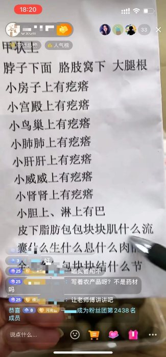经过一段时间观察后记者发现,主播提及的“囊什么肿”等“奇怪”的词汇,实际上都是医药类术语:囊肿、息肉、结节、甲状腺、汤药等,之所以这样说,目的是为了躲避平台的违禁词审查。