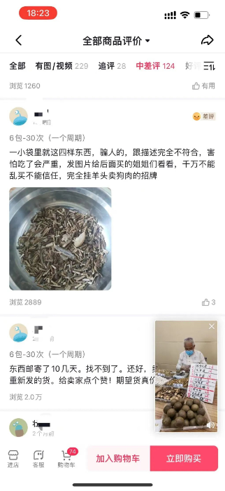 消费者还发现,在多款热销中药类产品的评价中,充斥着不同账号上传的相同评价和配图;还有部分商家通过添加患者微信,引导至第三方平台进行交易,以谋求更多不正当利益。