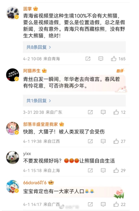此视频发布后,部分网友对视频中大熊猫的生存状况发生了担忧,也有网友对视频内容存在质疑。“视频里这种生境100%不会有大熊猫,要么是视频造假,要么是位置造假,总之是假新闻,没有意外。青海只有西藏棕熊,没有野生大熊猫,绝对!”微博认证为知名科学科普博主的“圆掌”跟帖回复说。