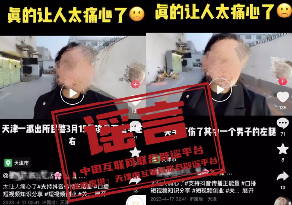 真相:4月17日,有自媒体账号发布关于“天津巡逻民警开枪打伤行凶男子致残”的视频,经与天津市公安机关核实,此为不实信息。现公安机关已依法立案,案件正进一步侦办中。请广大网民不造谣、不信谣、不传谣,及时关注官方权威消息,不传播未经证实信息,共同维护清朗网络空间。(来源:“天津辟谣”微信公众号)