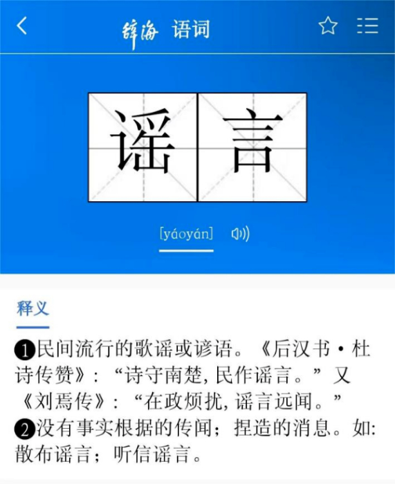 在《辞海》(第七版)释义中,“谣言”有着两种含义: