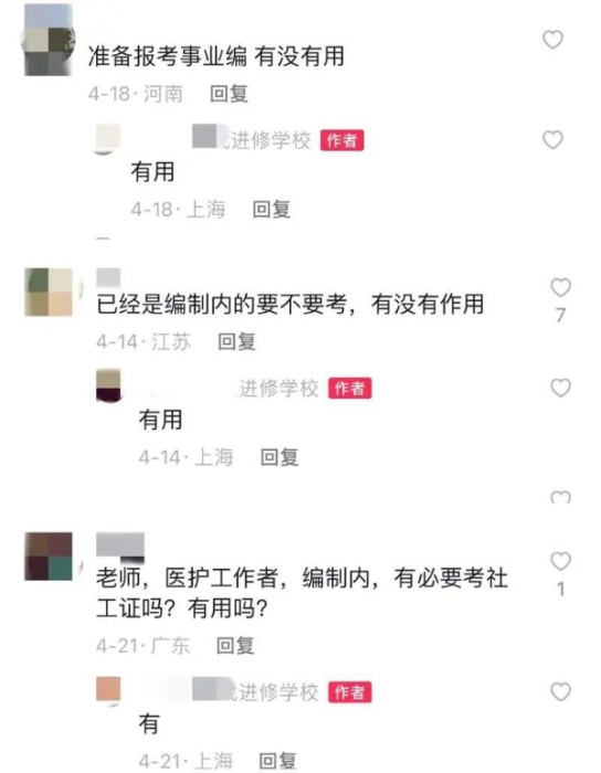 需要注意的是,部分主播为获取观看者信任,还会使用“先抑后扬”的话术,变相夸大“社工证”的作用。例如,用户名为“***进修学校”的主播在短视频里表示,考证要有“问题导向”,不要什么证都考,避免被割韭菜;但“善意提醒”后,主播话锋一转,明确表示考公务员、事业编等都需要“社工证”;在回答网友提问时,也明确表示这类工作需要有“社工证”。显然,他此前“不要多考证”的提醒只是为了抬高“社工证”的“含金量”,为推销培训课程做铺垫。
