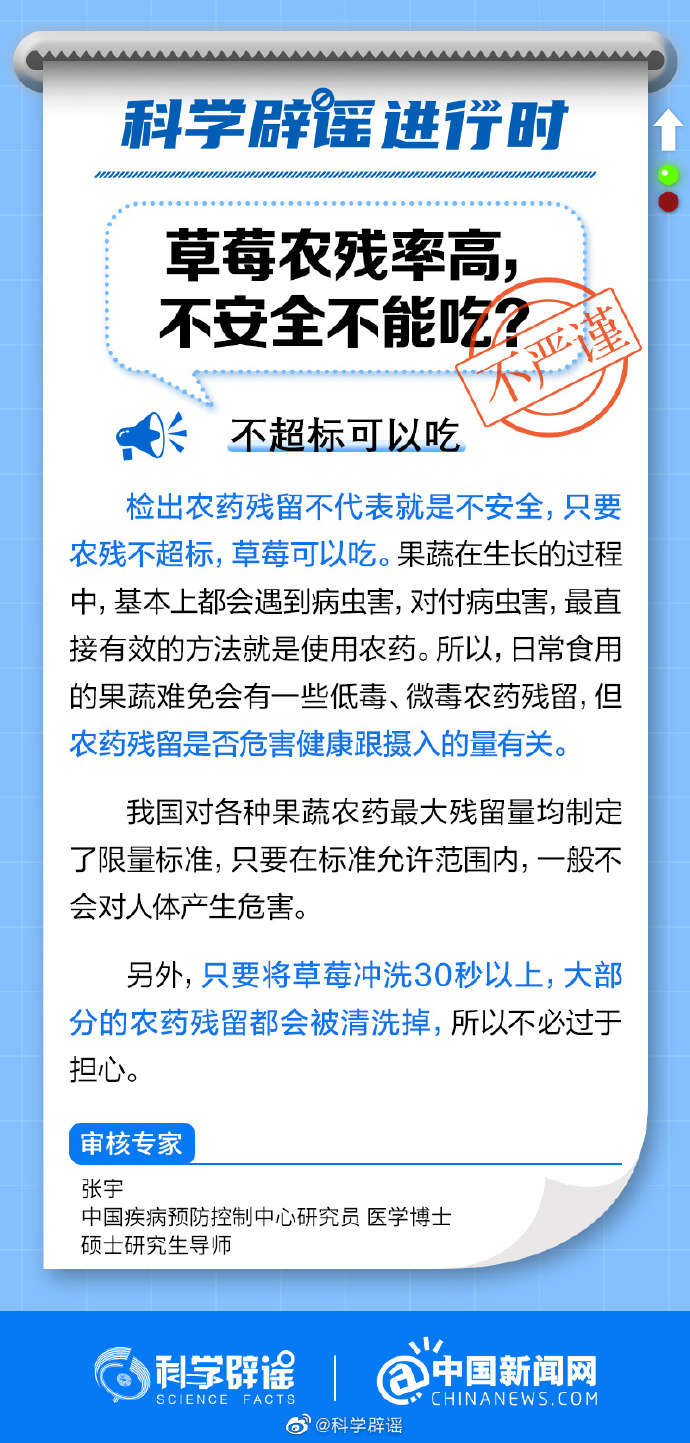 草莓农残率高,不安全不能吃?其实,检出农药残留不代表就是不安全,只要农残不超标,草莓就可以吃。我们日常食用的果蔬难免会有一些低毒、微毒农药残留,但农药残留是否危害健康跟摄入的量有关。只要将草莓冲洗30秒以上,大部分的农药残留都会被清洗掉,所以不必过于担心。