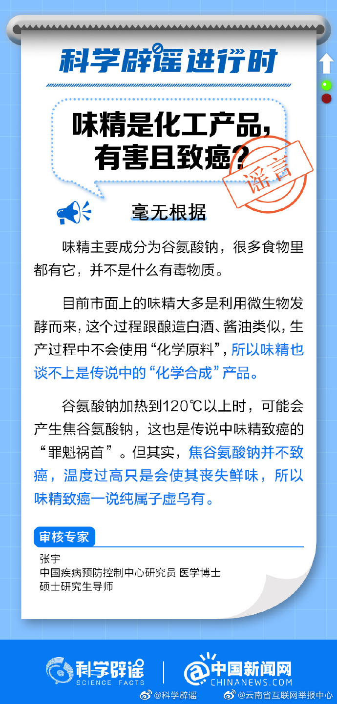 味精是化工产品,有害且致癌?毫无根据!目前市面上的味精大多是利用微生物发酵而来,生产过程中不会使用“化学原料”,所以也谈不上是“化学合成”产品。此外,味精主要成分为谷氨酸钠,谷氨酸钠加热到120℃以上时,可能会产生焦谷氨酸钠,但焦谷氨酸钠并不致癌,温度过高只会使其丧失鲜味,所以味精致癌一说纯属子虚乌有。