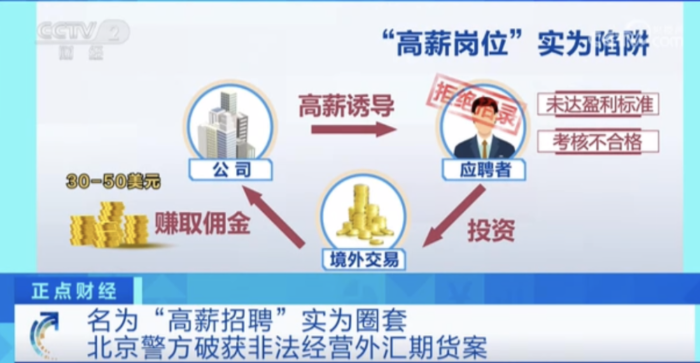 在考核阶段,公司会以高薪为诱饵,诱导应聘者每天都在指定的境外期货交易平台上投资。而公司在每笔交易中,都可以赚取境外平台30至50美元的佣金,直至应聘者的本金在交易中损失耗尽,公司再以“未达到盈利标准、考核不合格”为由,拒绝招录应聘者。目前,北京警方打掉相关犯罪团伙6个,刑事拘留犯罪嫌疑人51人,涉案金额近4亿元。