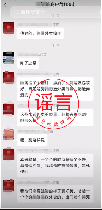 网安部门通过多方查证,证实该群聊截图系伪造,网传“某店铺辱骂外卖员”是谣言!