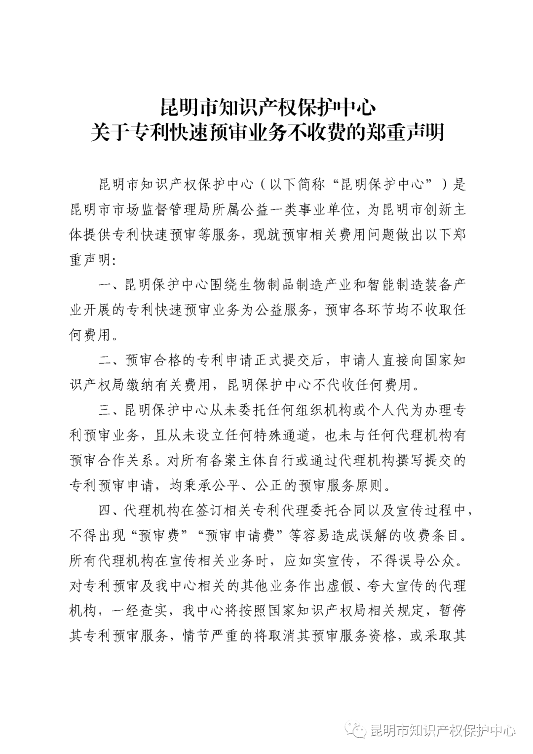 声明指出,预审合格的专利申请正式提交后,申请人直接向国家知识产权局缴纳有关费用,昆明保护中心不代收任何费用。同时,昆明保护中心从未委托任何组织机构或个人代为办理专利预审业务,且从未设立任何特殊通道,也未与任何代理机构有预审合作关系。