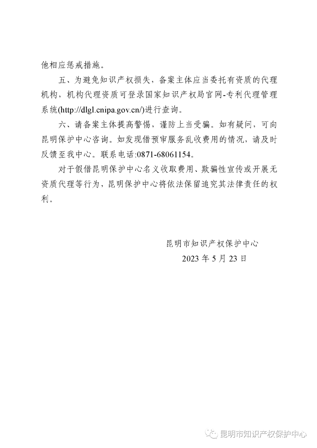 对于假借昆明保护中心名义收取费用、欺骗性宣传或开展无资质代理等行为,昆明保护中心将依法保留追究其法律责任的权利。