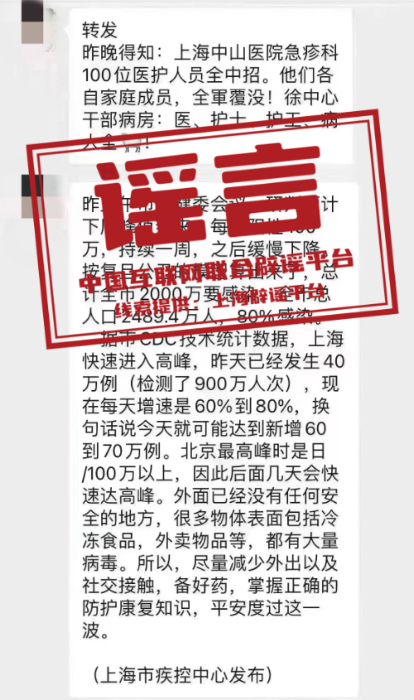 真相:近日,微信朋友圈流传一段以“上海中山医院急疹(注:原文误写,应为“诊”)科100位医护人员全中招,他们各自家庭成员,全军覆没!”为开头的长文,渲染医院大量医护人员感染新冠,引发舆论关注。对此,上海市卫健委表示,经向复旦大学附属中山医院、应急医疗管理部门核实,网传长文为不实信息,纯属捏造。有关媒体记者实地调查亦发现,无论是医护人员还是实际的发热病人,都没有网传内容描述的情况。网传内容错字连篇,试图用一种带有恐吓性质的口吻进行“友情提醒”,再引用一些过时、无关的数据假扮权威,实际传播的仍是虚假信息,请广大网民注意甄别,以免以讹传讹。(来源:“上海网络辟谣”微信公众号)