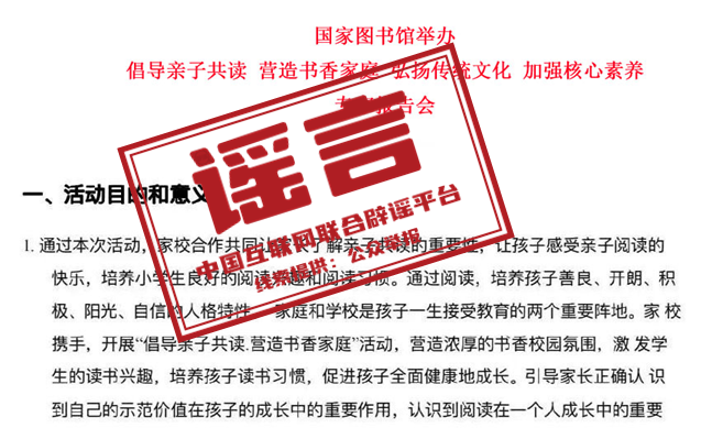 谣言:国家图书馆举办“倡导亲子共读”相关主题专家报告会并收取费用?