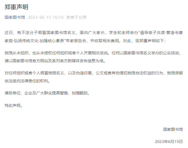6月15日,国家图书馆通过官方微信公众号发表声明,内容如下: