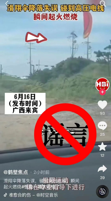 近日,网络传播一则声称6月16日广西来宾发生一起滑翔伞事故的视频,经核实,我市辖区内未发生相关事件。请大家不信谣不传谣。