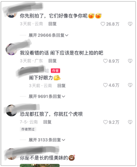 记者在抖音平台搜索后,发现这则消息最早发布于2023年7月4日10时50分,一位IP属地显示“云南”的网民,发布了一则3只老虎在森林打闹的视频,并配以文字“再也不敢去拾菌了……”该信息发布后,在网络上引起关注,截至7月9日19:35,该视频点赞量达26万,留言7.1万条。