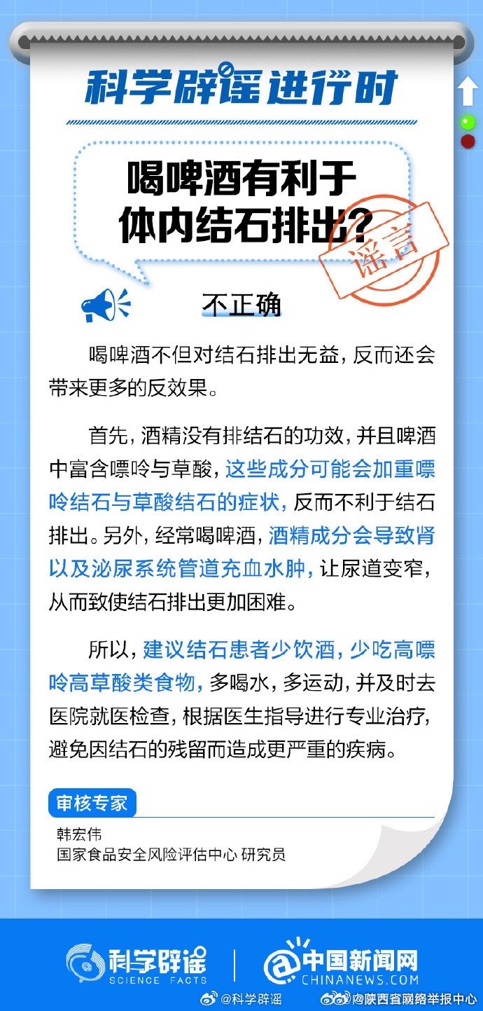 科学辟谣:喝啤酒有利于体内结石排出?