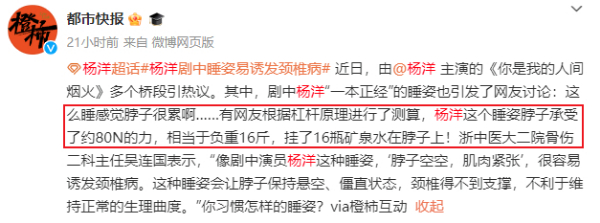 “像剧中演员杨洋这种睡姿,‘脖子空空,肌肉紧张’,很容易诱发颈椎病。”浙中医大二院(省新华医院)骨伤二科主任吴连国表示,这种睡姿相当于枕头只睡了一半,会让脖子保持悬空、僵直状态,颈椎得不到支撑,不利于维持正常的生理曲度。