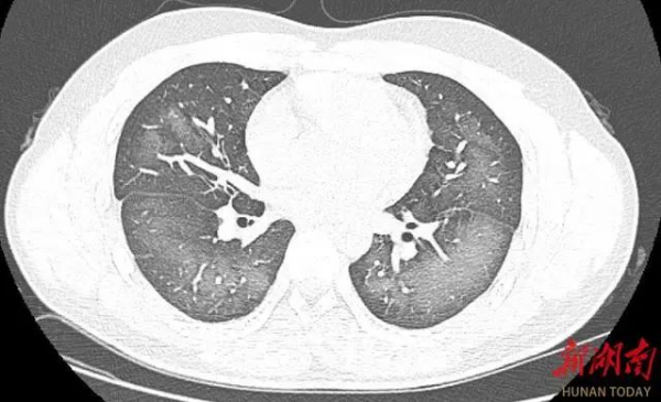 经检查,肺部CT片显示,李林双肺赫然呈现大范围白色样病变,报告提示“白肺”。