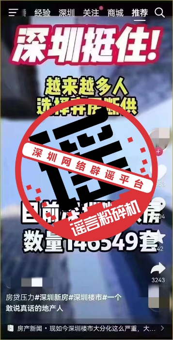 近日,有自媒体发布视频,对深圳楼市现状描述为“越来越多的人选择弃房断供,目前深圳断供房数量为146549套。”经过本网记者核实,视频内容严重失实,纯属谣言。