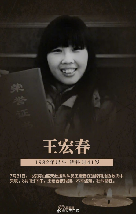 此次强降雨抢险救援中,北京市房山区蓝天救援队女队员王宏春和男队员刘建民不幸牺牲。