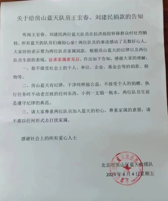8月4日,房山蓝天救援队针对公众给二人的捐款意愿发布告知。其中提到,根据“房山蓝天”的纪律以及两位队员生前一贯不接受馈赠的表现,征求家属意见后决定,不接受社会上的个人、单位、企业和基金会等的捐款、捐物等。