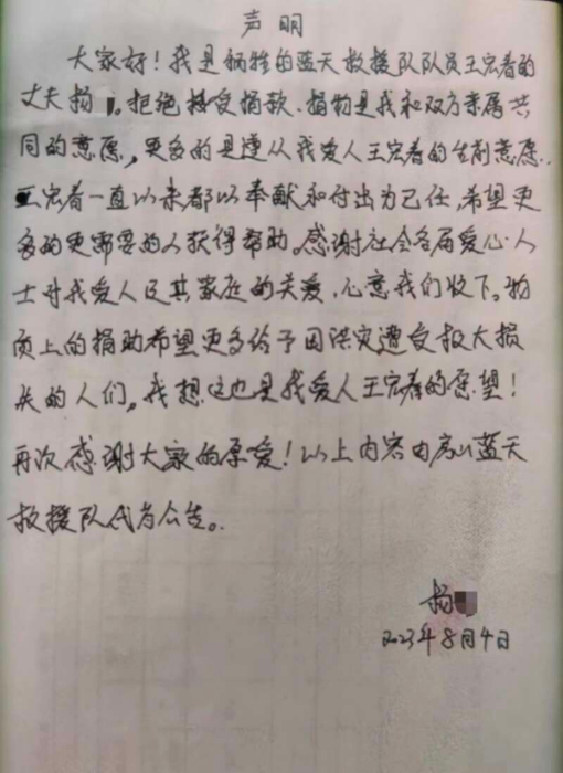 记者看到了一份王宏春丈夫杨先生8月4日手写的声明,声明显示,拒绝接受捐款、捐物是他和爱人亲属共同的意愿,更多的是遵从其爱人王宏春的生前意愿。