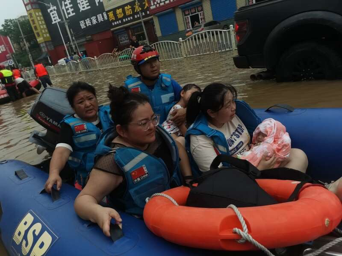 房山蓝天救援队在最近的暴雨灾害中转移出一名出生不足一周的婴儿。受访者供图
