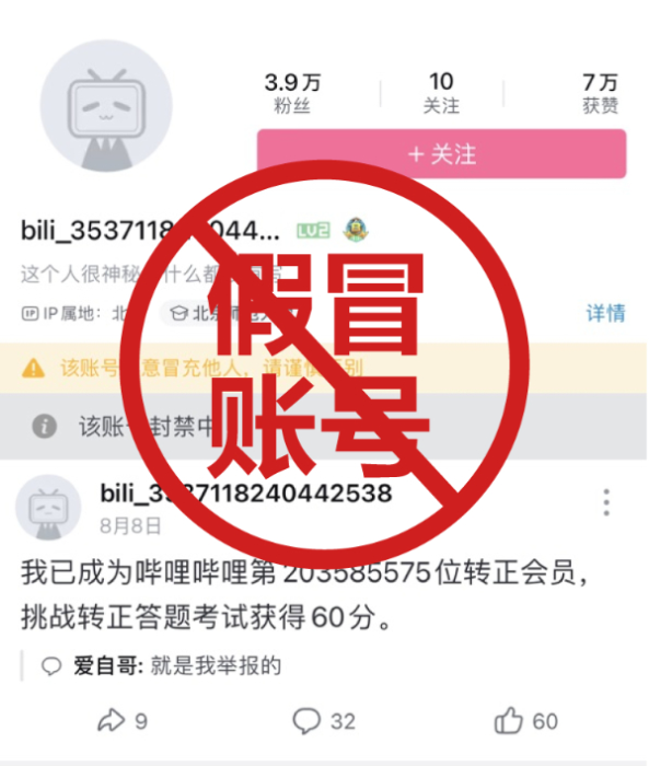 B站已对该高仿账号进行永封处理