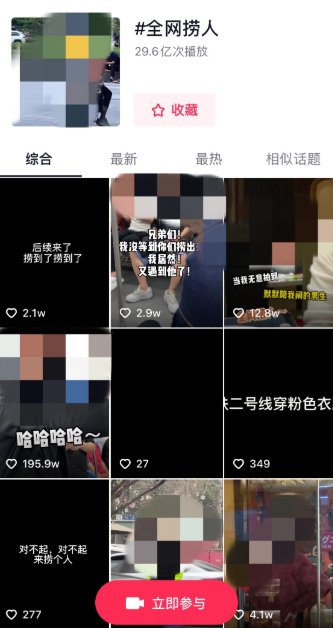 在某社交平台,“全网捞人”话题的浏览量达近一亿,“地铁捞人”话题的浏览量达3200多万。在某短视频平台,上述两个话题的浏览量更是分别高达29.6亿次和2.3亿次,一些热门“捞人”视频点赞破百万、评论数超十万,其中很多照片和视频都展现了被拍摄者的侧面或者正面形象。