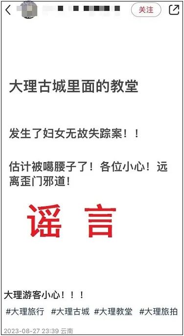 近日,某网民在自媒体平台发布图文称“大理古城里面的教堂发生了妇女无故失踪案!估计被噶腰子了!各位小心!远离歪门邪道!”并警告“大理游客小心”。发现该信息后,大理警方及时开展核查,近期辖区内并未发生过类似案事件,该网民所发图文为虚假信息。