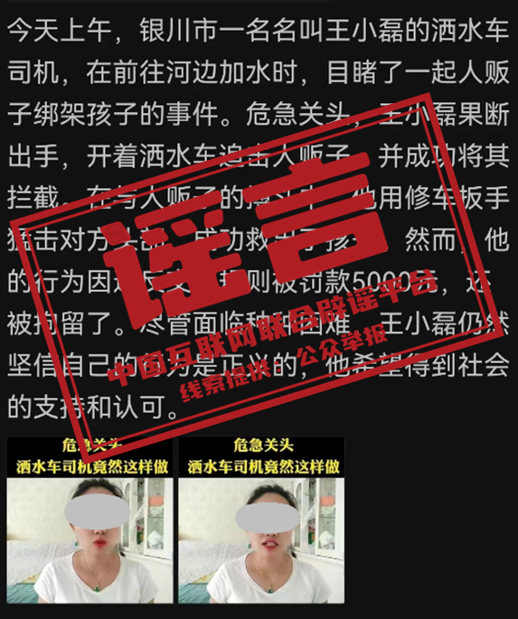 真相:有网民在某平台发布视频称“银川一洒水车司机见义勇为,开车拦截人贩子,在搏斗中将人贩子打伤,成功救出被拐小孩,最终却因违反交通法规被公安机关予以行政拘留并处罚款5000元的处罚”。经银川警方核查,该视频为不实信息。视频发布者寇某为吸引粉丝、赚取流量,将网上“外省某洒水车司机勇救被拐小女孩”的视频进行修改,并配上虚假文案,制作成短视频于某平台发布。目前,银川警方依法对寇某予以行政处罚。(来源:宁夏互联网辟谣平台)