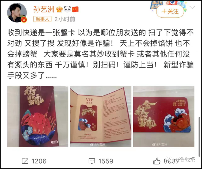 孙艺洲发文称:收到快递是一张蟹卡,以为是哪位朋友送的,扫了下觉得不对劲,又搜了搜,发现好像是诈骗!天上不会掉馅饼,也不会掉螃蟹,大家要是莫名其妙收到蟹卡,或者其他任何没有源头的东西,千万谨慎!别扫码!谨防上当!