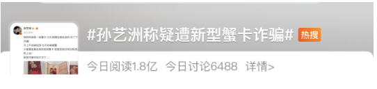 10月7日,“男演员孙艺洲称疑遭新型蟹卡诈骗"引起热议。