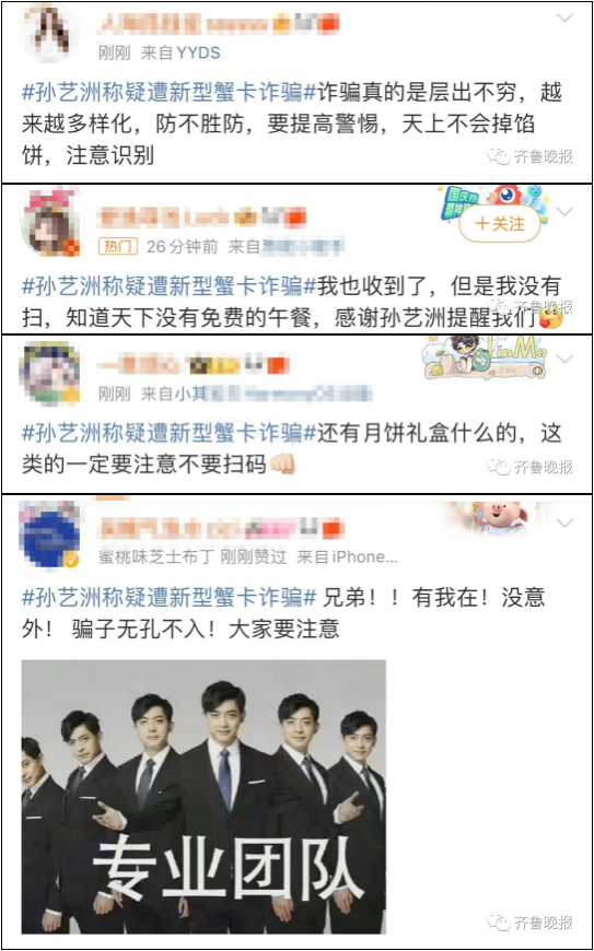 孙艺洲发文称:收到快递是一张蟹卡,以为是哪位朋友送的,扫了下觉得不对劲,又搜了搜,发现好像是诈骗!天上不会掉馅饼,也不会掉螃蟹,大家要是莫名其妙收到蟹卡,或者其他任何没有源头的东西,千万谨慎!别扫码!谨防上当!