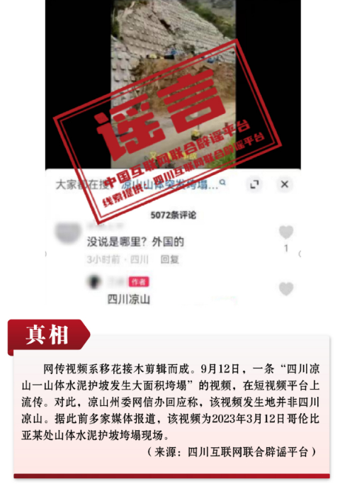搭蹭热点谎报灾情损公益。随着备受瞩目的杭州亚运会拉开帷幕,有商家搭蹭热点借亚运会重要赛事活动博取关注,散布“快递停发通知”谣言,意图增加销量牟取利益;受台风“海葵”残余环流影响,福建、广东等地持续降雨导致洪涝灾害,网上随之出现一些谣言,比如“深圳极端特大暴雨南山区停工一天”“深圳龙岗区龙河路有人被冲进河流”“深圳龙岗内涝外卖员因漏电死亡”等谣言,或移花接木、或张冠李戴,干扰抢险救灾工作;还有人编造传播“四川凉山一山体水泥护坡发生大面积垮塌”的短视频,引发网民议论,但事实上该视频是将南美洲哥伦比亚某处山体水泥护坡垮塌现场偷梁换柱而来,这种随意剪辑视频捏造假消息的行为,歪曲事实、挑动情绪,严重损害社会公益。