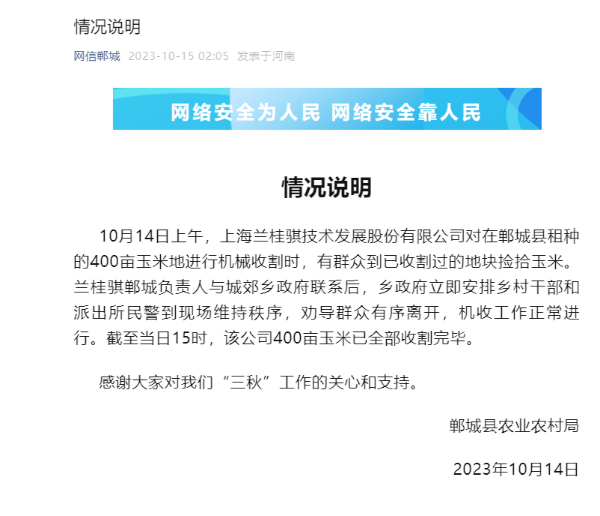 10月14日上午,上海兰桂骐技术发展股份有限公司对在郸城县租种的400亩玉米地进行机械收割时,有群众到已收割过的地块捡拾玉米。兰桂骐郸城负责人与城郊乡政府联系后,乡政府立即安排乡村干部和派出所民警到现场维持秩序,劝导群众有序离开,机收工作正常进行。截至当日15时,该公司400亩玉米已全部收割完毕。感谢大家对我们“三秋”工作的关心和支持。