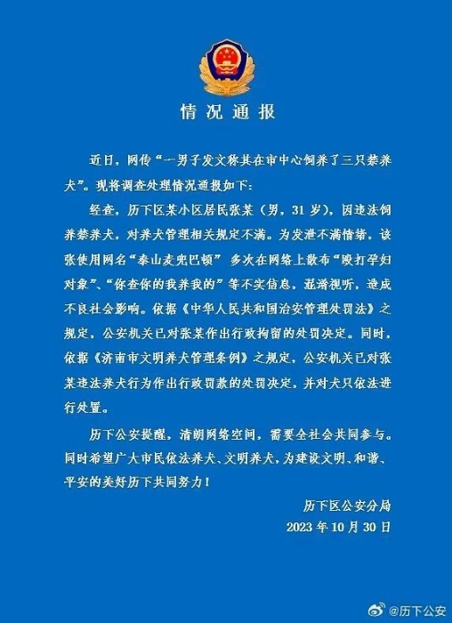 近日,网传“一男子发文称其在市中心饲养了三只禁养犬”。30日晚,山东济南公安历下区分局官方微博通报调查处理情况: