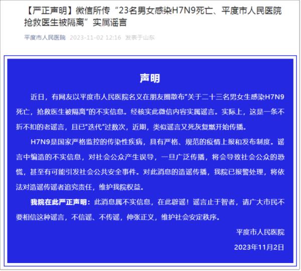 近日,有网友以平度市人民医院名义在朋友圈散布“关于二十三名男女生感染H7N9死亡,抢救医生被隔离”的不实信息。经核实此微信内容实属谣言。实际上,这是一条不折不扣的老谣言,且已“迭代”过数次,近期,类似谣言又死灰复燃开始传播。
