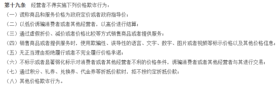 法治网记者注意到,2022年4月,国家市场监督管理总局发布的《明码标价和禁止价格欺诈规定》已明确了几种典型的价格欺诈行为,包括:谎称商品和服务价格为政府定价或者政府指导价;以低价诱骗消费者或者其他经营者,以高价进行结算;通过虚假折价、减价或者价格比较等方式销售商品或者提供服务;销售商品或者提供服务时,使用欺骗性、误导性的语言、文字、数字、图片或者视频等标示价格以及其他价格信息等。