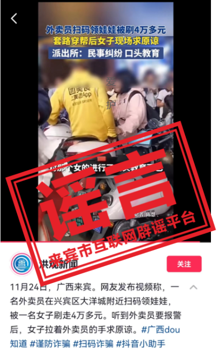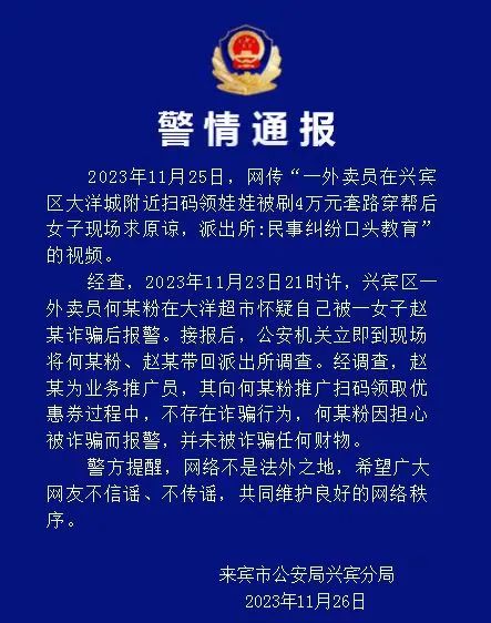 网传:视频称“2023年11月23日21时许,一外卖员在来宾市兴宾区大洋城附近扫码领取娃娃被刷4万元套路穿帮后女子现场求原谅,派出所:民事纠纷口头教育。”