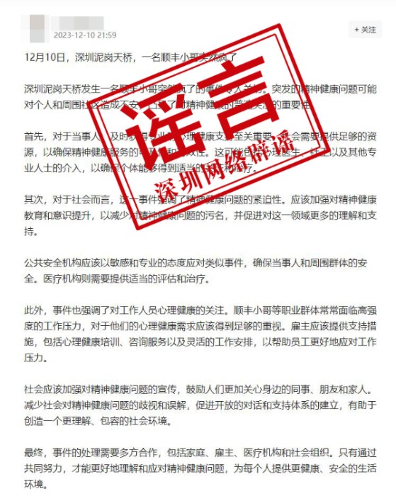 12月10日,某社交平台网友发帖称,“12月10日,深圳泥岗天桥,一名顺丰小哥突然疯了。”记者向顺丰公司求证,该信息为谣言。