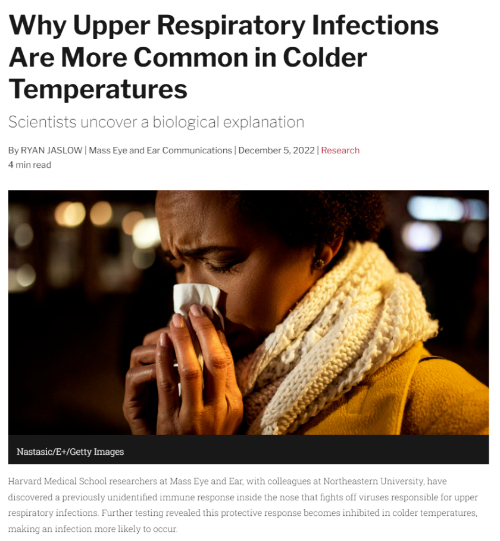 哈佛医学院最近公布一项关于鼻部免疫机制的新研究,研究发现,寒冷天气实质会让我们更容易遭到上呼吸道感染。
