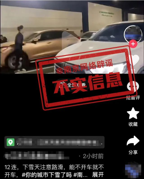12月18日,南京普降大雪,网上流传一条关于“过江隧道多辆汽车连环追尾”的视频,并以此提醒网民“下雪天注意路滑”“能不开车就不开车”,引起不少网民询问具体事发地点并关注现场情况。
