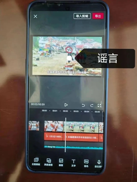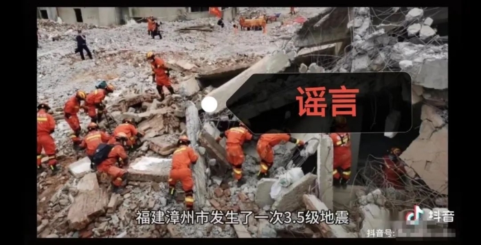 近日,福建省漳州市华安县发生3.5级地震。违法行为人施某为了吸引流量赚钱,利用AI视频剪辑软件编辑生成相关视频,并通过自己的抖音号进行传播。视频中配图显示地震导致房屋倒塌、严重损毁以及消防、解放军等相关部门在现场救援,视频中虚构的配图、文案与事实严重不符。