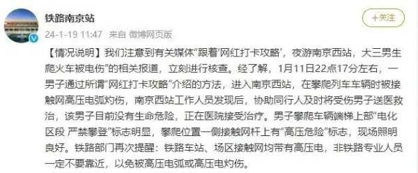 1月19日,铁路南京站官方微博就“大学生到网红打卡地爬火车被电伤”一事发布情况说明。