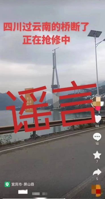 2月5日,一网民在网络平台发布视频,称“四川过云南的桥断了 正在抢修中”,引起关注。