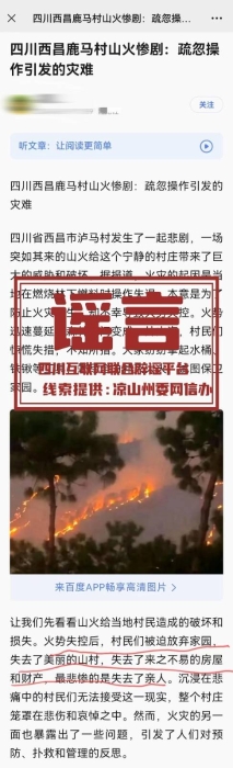 近日,有网民发布谣言信息,称“村民们面临着前所未有的危险,举家逃离。人们的财产和希望,瞬间消失殆尽”“火势失控后,村民们被迫放弃家园,失去了美丽的山村,失去了来之不易的房屋和财产,最悲惨的是失去了亲人。”