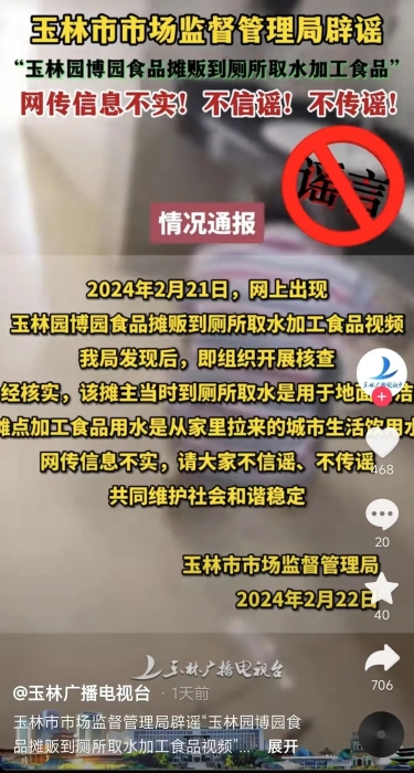 2月22日,广西玉林市市场监督管理局发布情况通报表示,经核实,视频中摊主到厕所取水是用于地面清洁,加工食品用水是从家里拉来的城市生活饮用水,网传信息不实。