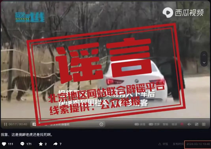 3月10日,有网民在某社交平台发布短视频,配文称“近日北京,八达岭野生动物园一游客在孟加拉虎园区域下车,老虎发现有人下车后快速跑到围栏旁盯着该游客。”